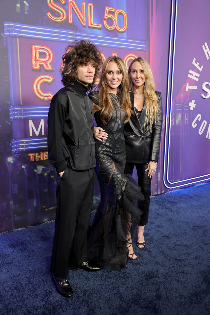 Майли Сайръс с майка си и приятеля си Макс Моранд. Снимка: Getty
