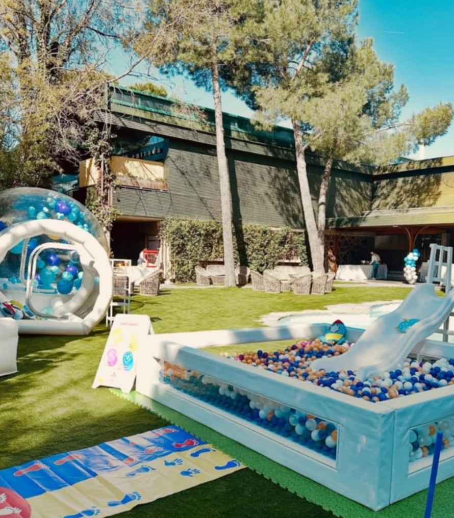 Тя също така показа басейна с разноцветни с топки и арка от сини балони и големи висящи декорации във формата на планета.