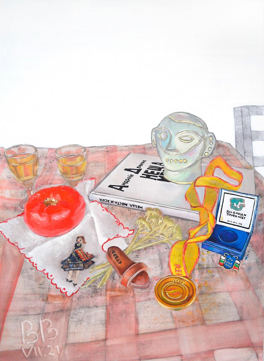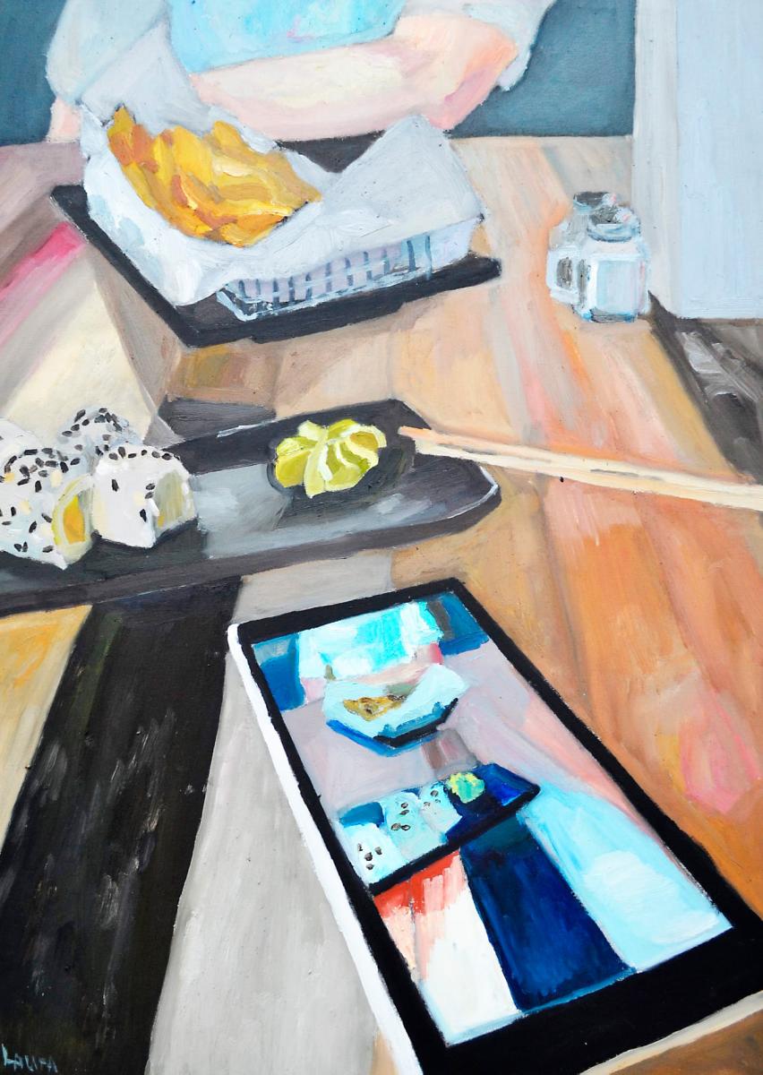 „Заглавието на картината е „Обяд“. Тя представя кадър от обичан от мен ресторант с човек, в чиято компания ми е приятно да бъда. По време на локдауна това беше немислимо.“