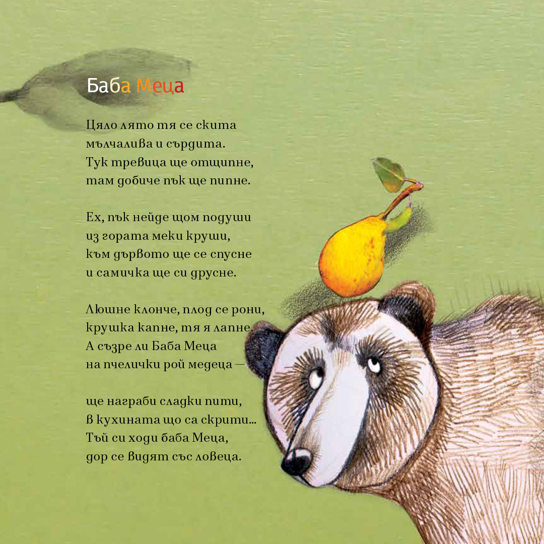 Най-честите герои на стихотворенията са любимите на децата животни, а талантливите илюстрации на художничката Невена Ангелова осигуряват незабравимо преживяване на бъдещите малки читатели.