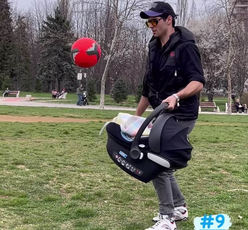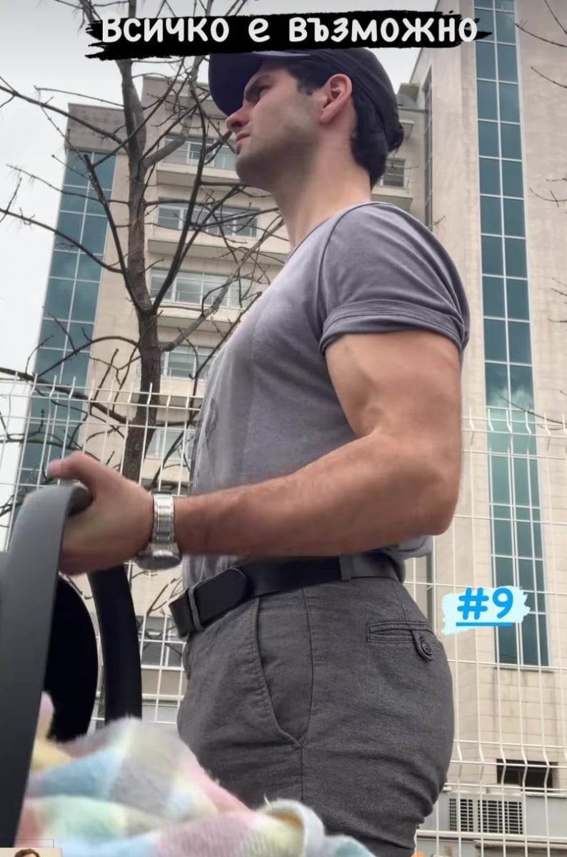 А в следващите кадри използва бебешката кошница вместо гира. Вероятно с тежест около 15 килограма, което е напълно достатъчно, за да поддържа спортна форма.