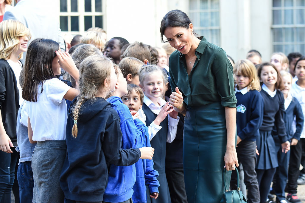 Дукесата на Съсекс и принц Хари, които преди няколко дни обявиха, че очакват първото си бебе, в началото на октомври се появи в изключителна форма сред ученици в Брайтън, решена в ефирна блуза и кожена пола в маслено зелено. Снимка: Guliver/Getty Images