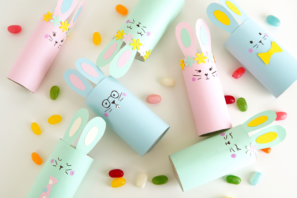 Тези зайчета може да се изработят от празните ролки от тоалетната хартия. Нека децата ги облепят с гланцова хартия в по-нежни и пастелни нюанси.