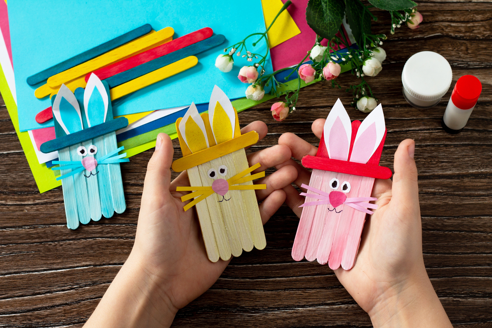 За тях са ви нужни дървени плоски клечки – като тези за сладолед на клечка. Децата трябва да ги боядисат в различни цветове – по 6 клечки за всеки цвят. След това им помогнете внимателно да слепят 5 една до друга и шестата да бъде напречно, там където ще е шапката на зайчето.