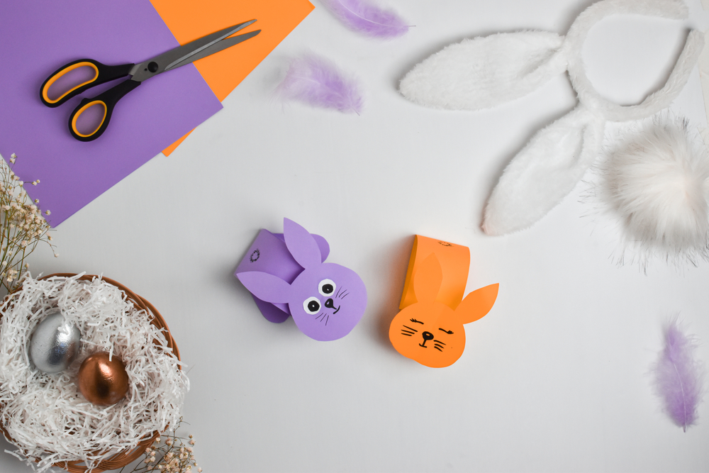 Пръстенчетата се изработват много лесно. Те всъщност представляват хартиена лента, завита и залепена под формата на по-широк пръстен. Върху нея се залепва изрязано от същия цвят хартия зайче.