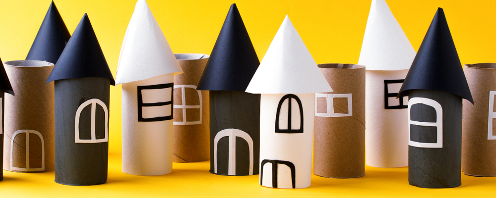 То става много лесно и бързо. Някои от ролките нямат нужда от боядисване, а другите нека бъдат в черно, бяло и кафяво. Върху всяка къщичка децата да поставят покрив от фунийка хартия в същия цвят. След което да нарисуват с флумастери прозорци и врати на къщите. И една идея – ако добавите между къщите малко светлинки, селото ще заблести много красиво.