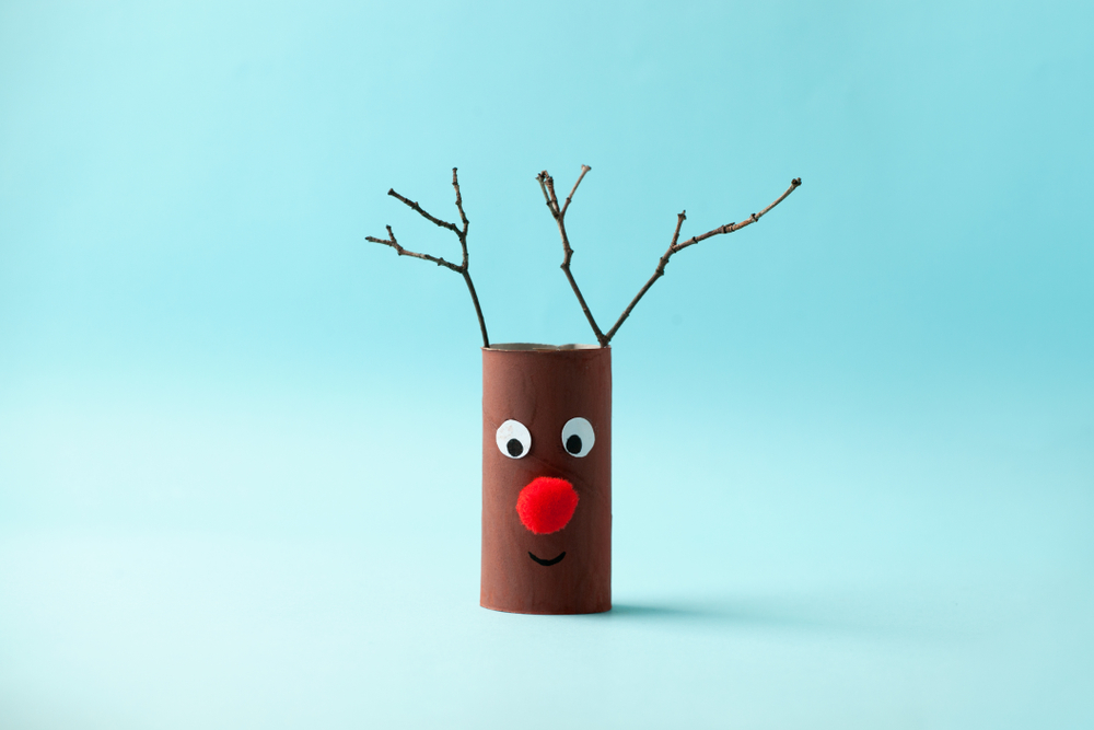 Трябва да боядисат ролката в кафяво, после да нарисуват очи, а за нос да използват червено топче за декорация. Рогата са от тънки клонки, които могат да залепят от вътрешната страна с тиксо.
