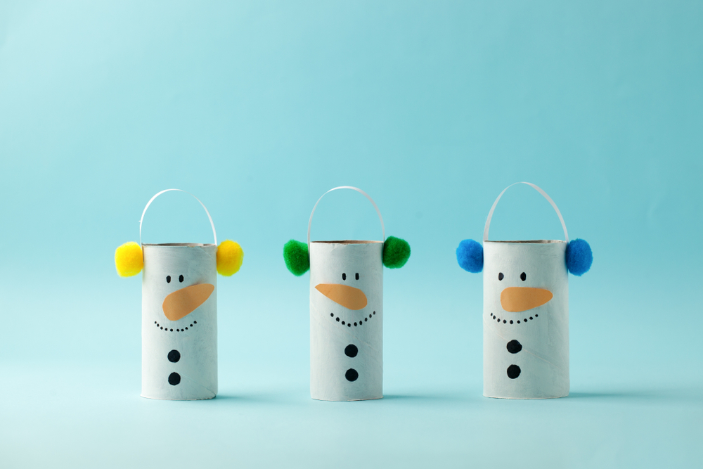 Трябва да боядисат в бяло (или облепят с бяла хартия) ролките. После да нарисуват очи, уста и нос. Най-отгоре нека залепят лентичка бяла хартия като диадема, а отстрани да сложат по едно пухкаво декоративно топче. Така и снежните човеци ще бъдат с топли уши през зимата.