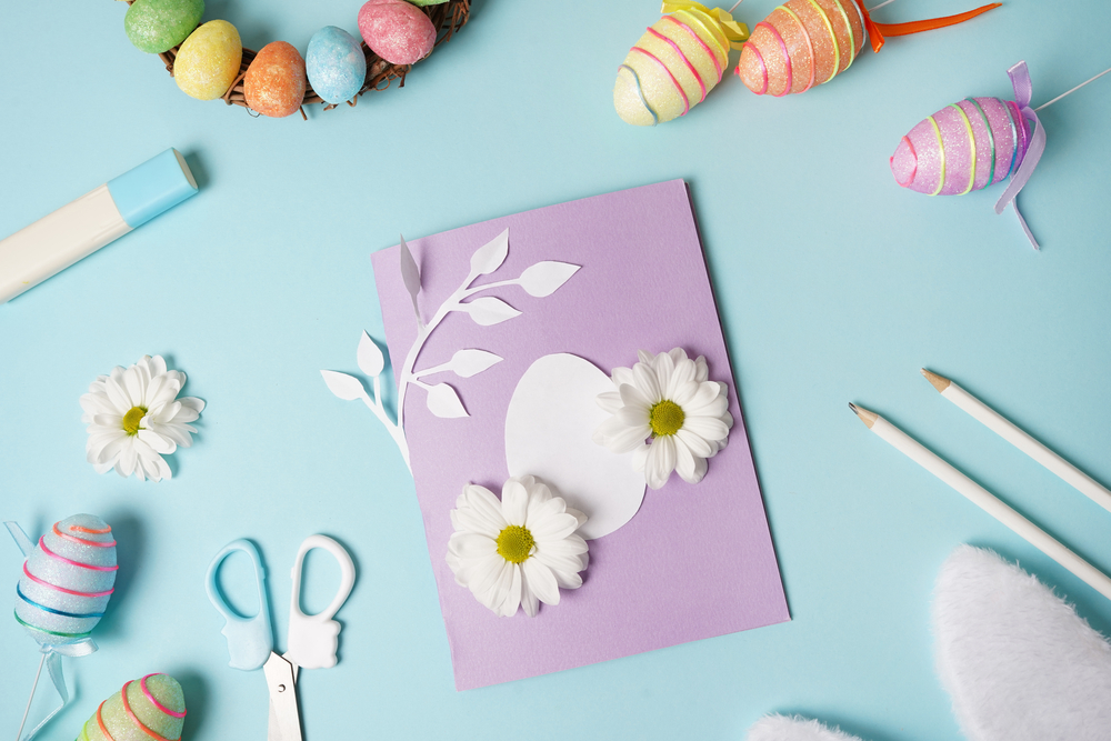 Върху нея децата нека залепят едно голямо бяло яйце, към което да апликират истински цветове от маргаритки или други цветя. На финала нека добавят и внимателно изрязана клонка от бяла хартия, която да създаде още по-красив 3D ефект.