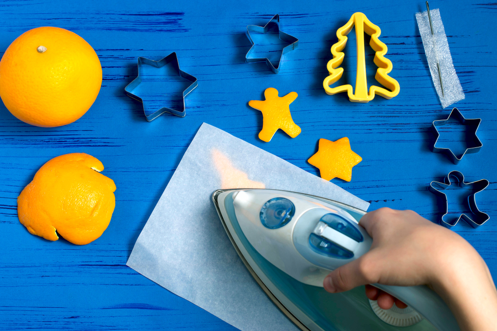 Обелете кората на плодовете, като се стремите да запазите максимално големи парчета. С помощта на метални формички за сладки заедно с децата изрежете от кората фигурки: звезди, камбанки, джинджифилово човече…