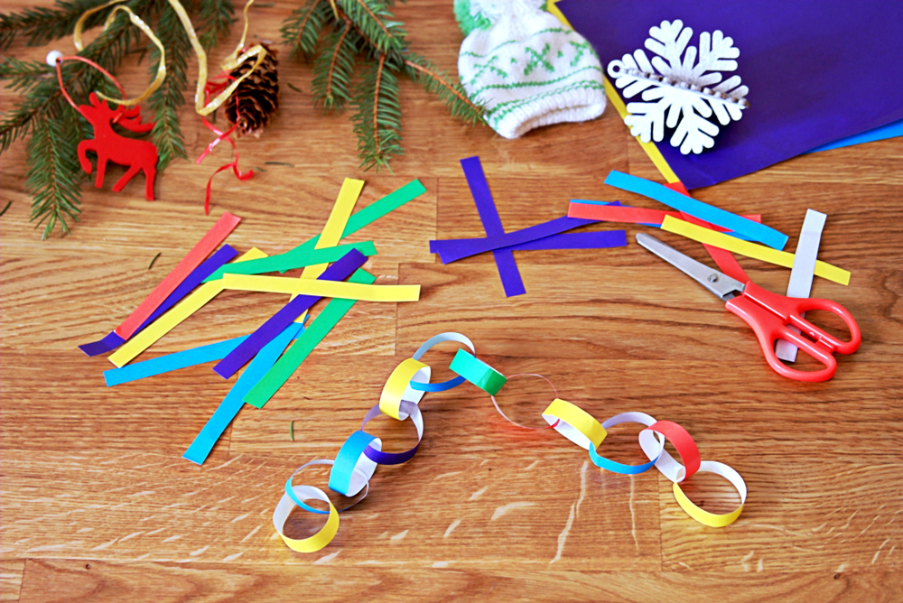 Нека детето изреже лентички, след което заедно ги залепете една за друга като халки. Бързо, лесно и ефектно. А за родителите – приятен спомен от детството.