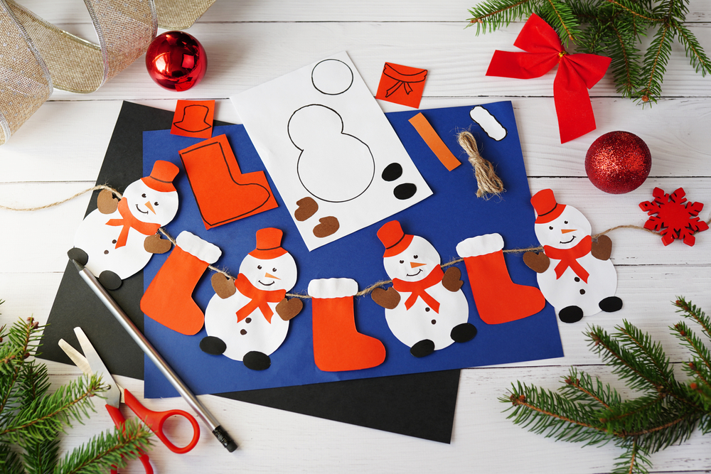 Нарисувайте върху червена или бяла хартия снежни човеци и коледни ботуши, след което накарайте детето да ги изреже, следвайки контура.