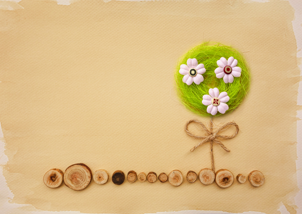 Вместо трева може да подредите отрязани кръгчета от сухо клонче. Стволът на дървото направете от канап, завързан на панделка, а короната – от декоративна трева в свежо зелено.