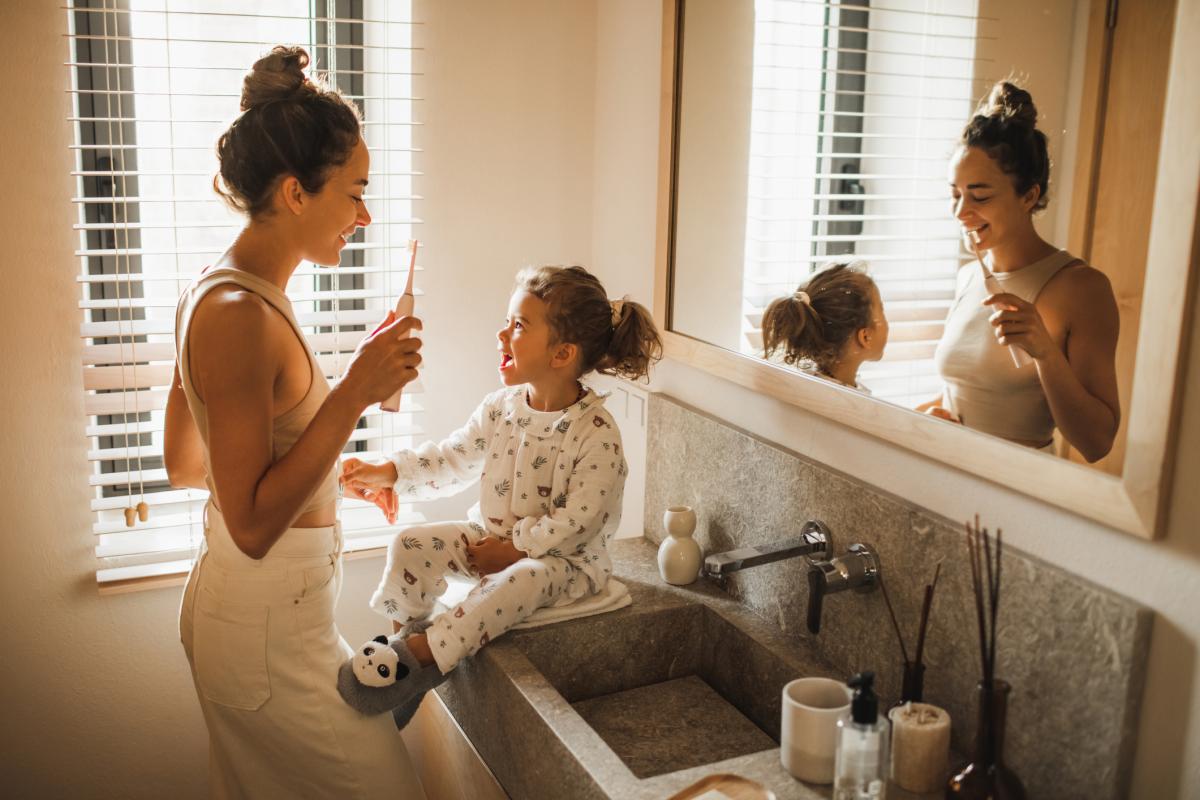 Майка и дъщеря си мият зъбите. Снимка: Getty