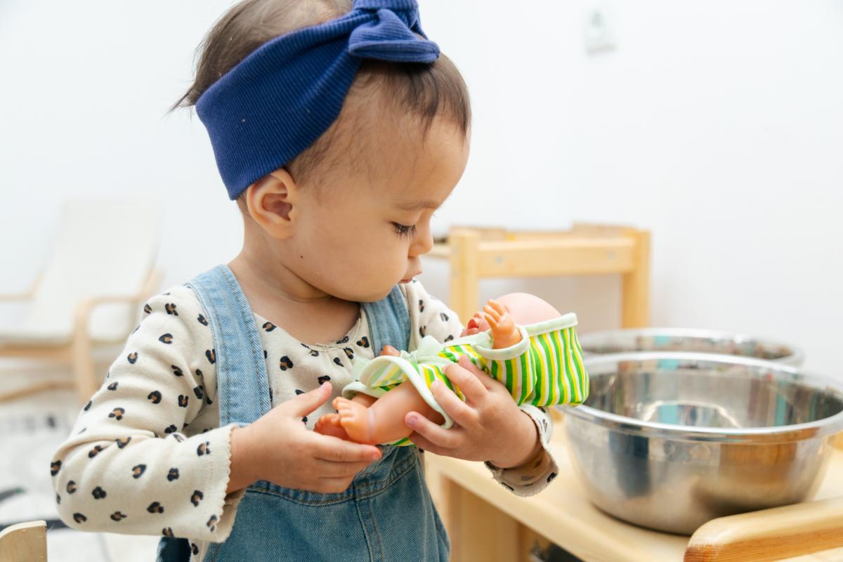 Вгледайте се по-внимателно как детето влиза в ролята на мама и се грижи за бебето-кукла.