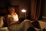 Жена чете книга на нощна светлина.