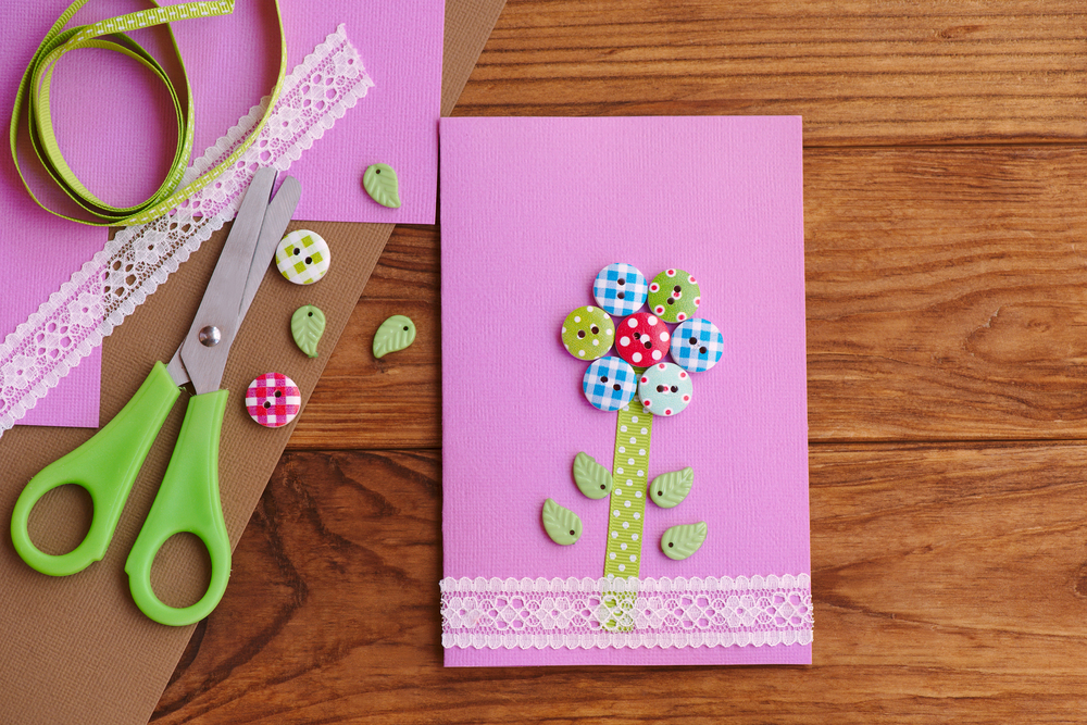 Материалите, които ви трябват за тази картичка са: копчета в различни цветове и форма, зелена панделка и дантелен галон.