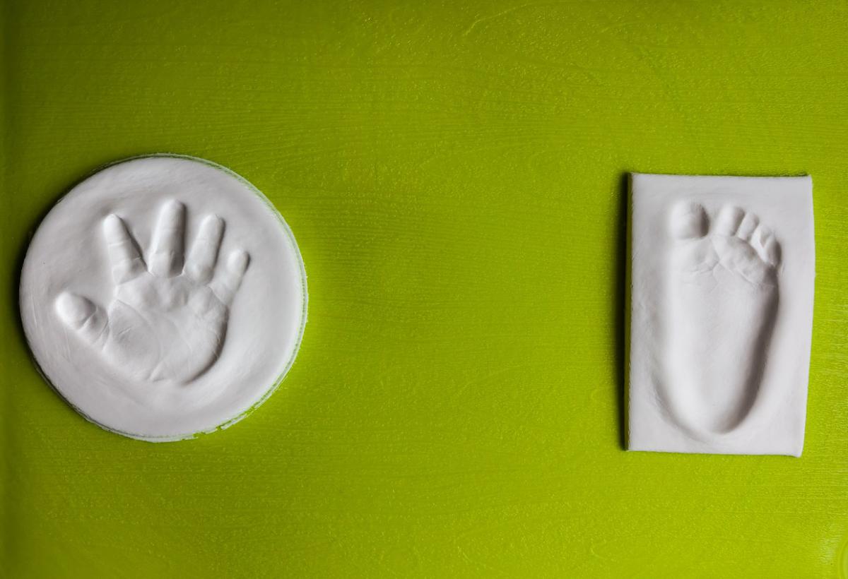 Комплект за отпечатък. Повечето комплекти, които се продават у нас, включват рамка за снимки и отпечатъци от крачето и ръчичката на бебето.