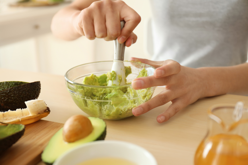 Измийте и обелете авокадото, след което го смачкайте. Добавете овесените ядки, разбъркайте и смесете с останалите съставки. Нанесете сместа върху кожата, оставете да стои 20 минути и изплакнете.