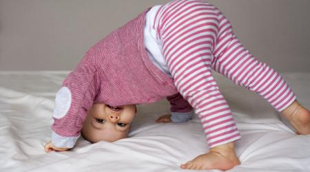 Поставете бебето върху надуваемата топка по корем така че да се отблъсква с крака от пода.
