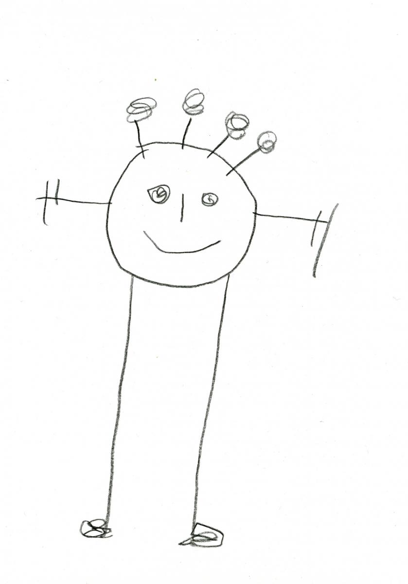 След 4 години: всички части на тялото са нарисувани, някои са непропорционални. На лицето има усмивка.