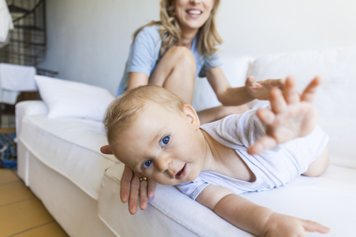 Между 6 и 9 месеца бебето се научава да седи. Това означава, че заема най-удобната позиция, която му позволява да види желания обект и да посяга към него вече съзнателно и точно. Благодарение на новооткритата подвижност и гъвкавост в раменете и лактите, то вече успява да задържи предмета между палеца и малкия си пръст.