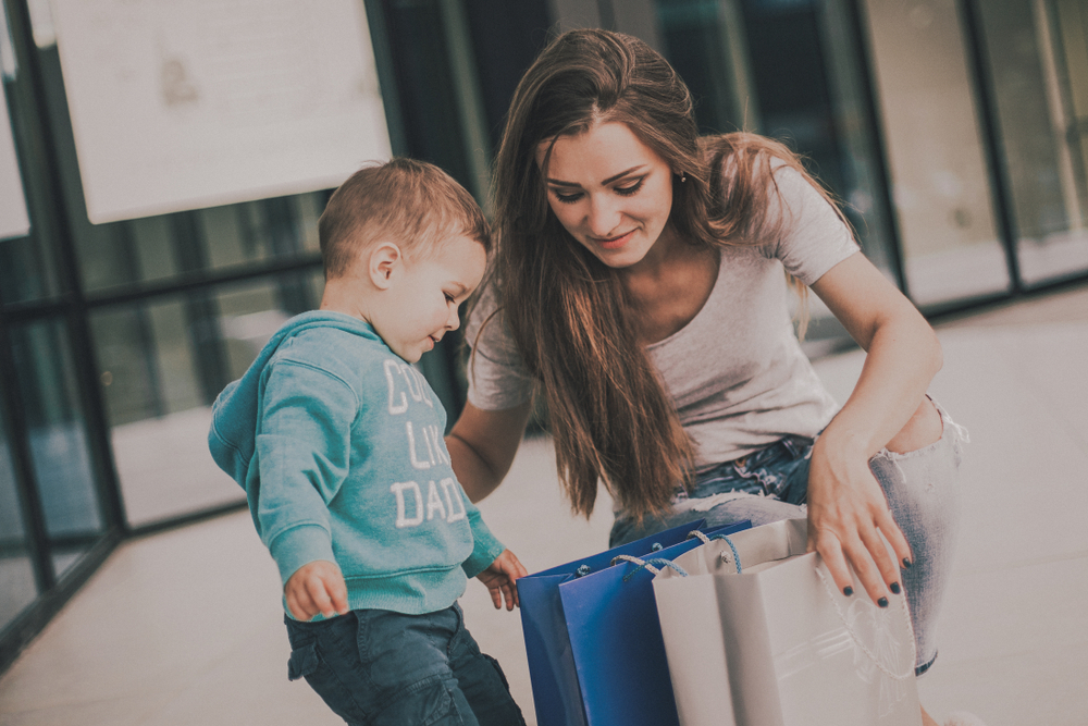 Майка показва на детето какво е купила. Снимка: Shutterstock