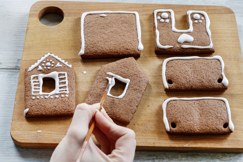След като тестото се охлади напълно, с тънка четка за рисуване и белтъчна глазура, украсете всяка част.