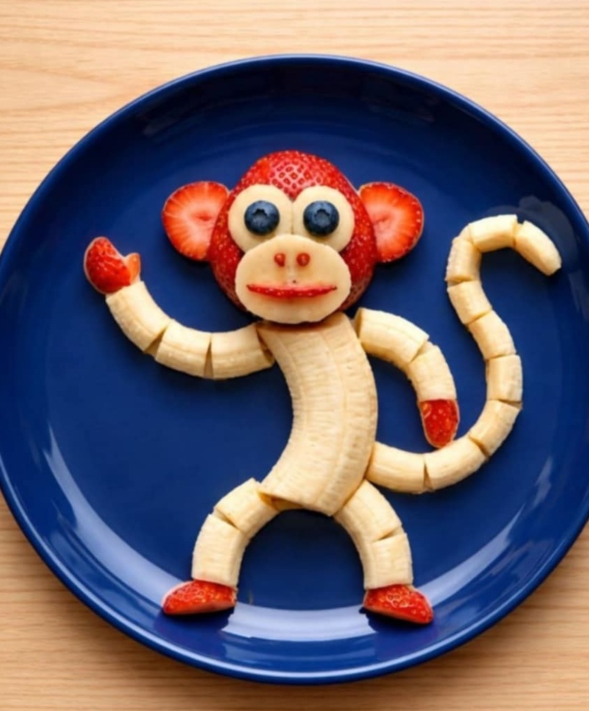 За тази весела маймунка ви е нужен само 1 банан, 2 боровинки и ягоди.