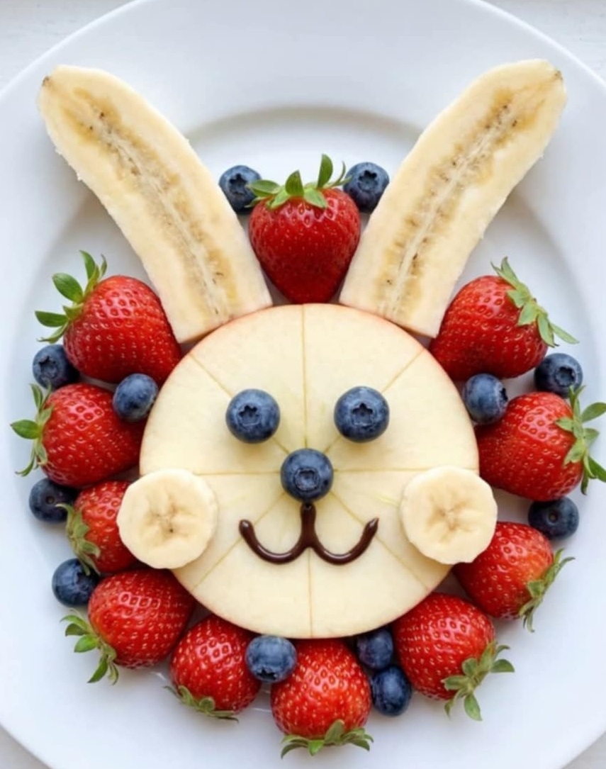 За да направите това зайче, не се нуждаете от особени кулинарни умения. Ако имате ябълка за главичката, банан за ушите, ягоди и боровинки за украса.