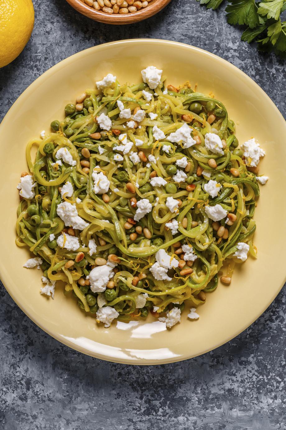 Сварете 400 г спагети в 2 л горещ подсолен зеленчуков бульон и гледайте да останат ал денте – крехки, но твърди. Прецедете, и във все още врящата вода пуснете 2 тиквички, но преди това измити и нарязани на много фини ленти – може да ги минете през месомелачката. След 3-4 минути прецедете и тях, смесете ги със спагетите и добавете по 2 с. л. от каквото обичате, например кедрови ядки, 2 с. л. каперси от консерва, натрошено сирене.