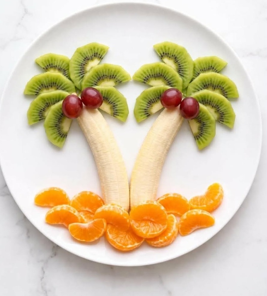 Отново задачата е супер лесна: работи се с 1 банан, разделен на две, едно киви на резани, 4 зърна от грозде и мандарини за "пясъка".