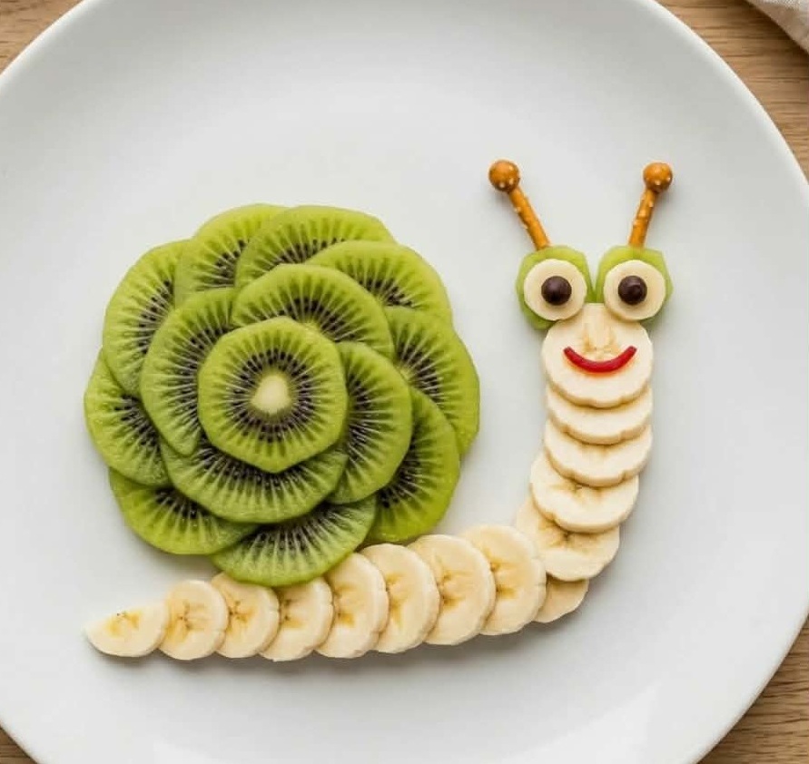 За този елегантен охлюв ви трябва 1 банан, 1 киви, 2 боровинки и 1 солета за рогцата, която да разчупите на 2.