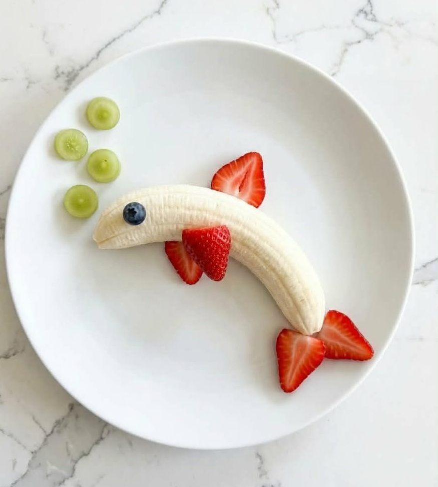 Делфинът се сглобява от 1 банан, 2 ягоди, разделени на половина  и 1 боровинка за око.