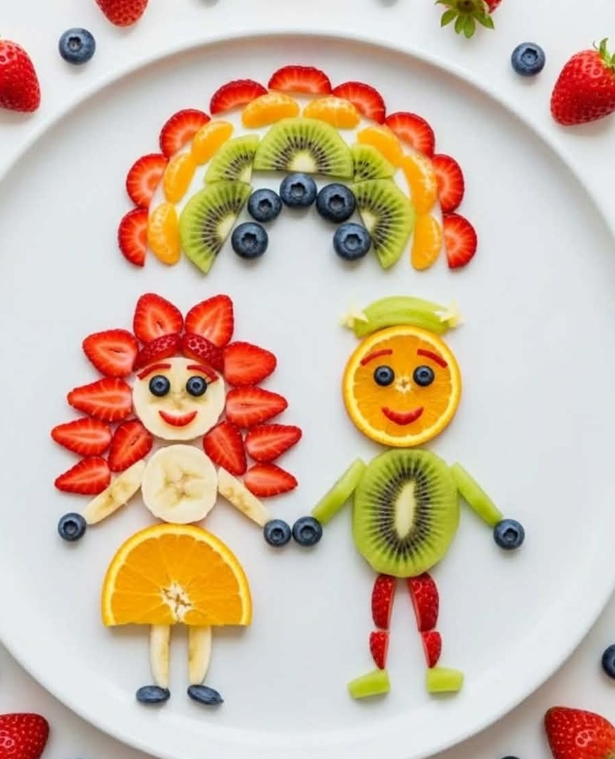 За да улесним максимално задачата, сме включили малко продукти – ягоди, банан, киви, боровинки ... и лесни форми, които да бъдат подредени в чинията.