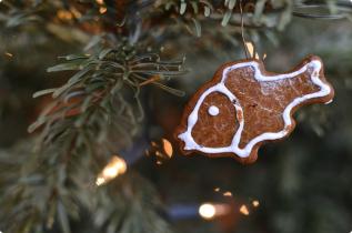 Печена бисквитка с формата на рибка, която виси на елхата. Снимка: Shutterstock