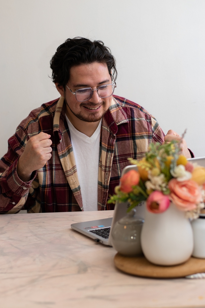 Мъж, щастлив че е открил онлайн подходящ партньор. Снимка: Shutterstock