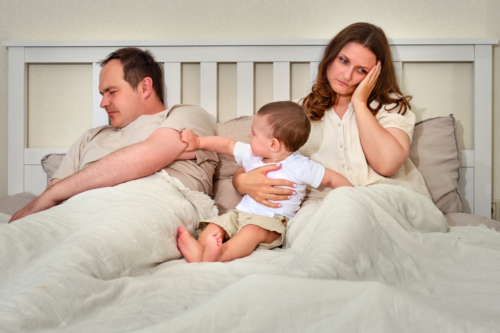 Уморена майка с бебе, безразличен баща. Снишмка: Shutterstock