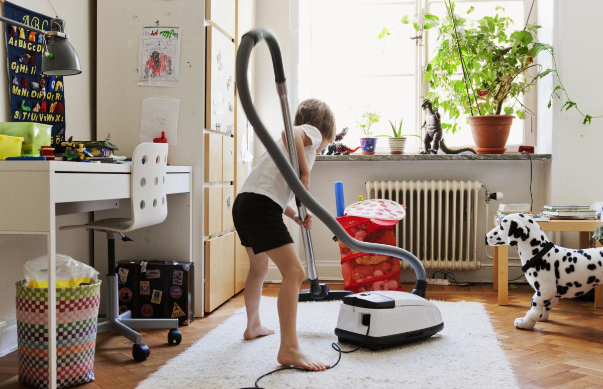 Момче чисти с прахосмукачка стаята си. Снимка: Getty