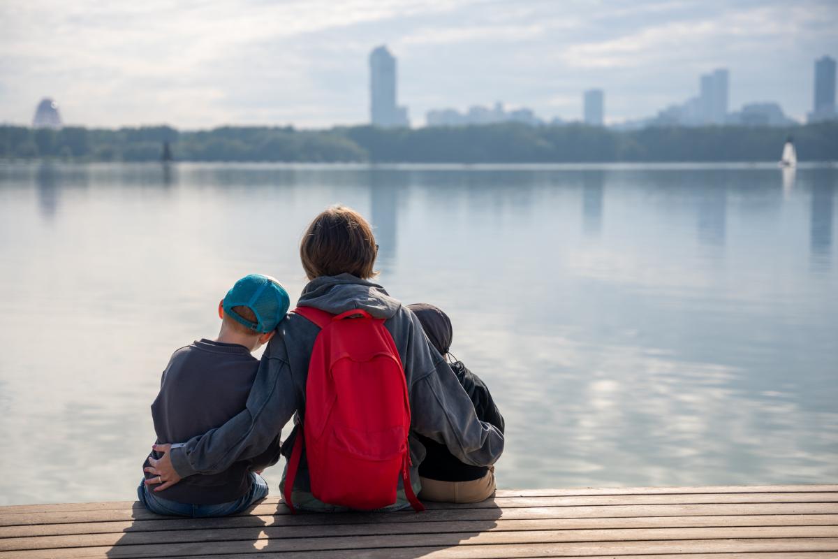 Майка, пригръца двамата сина на брега на езеро. Снимка: Getty