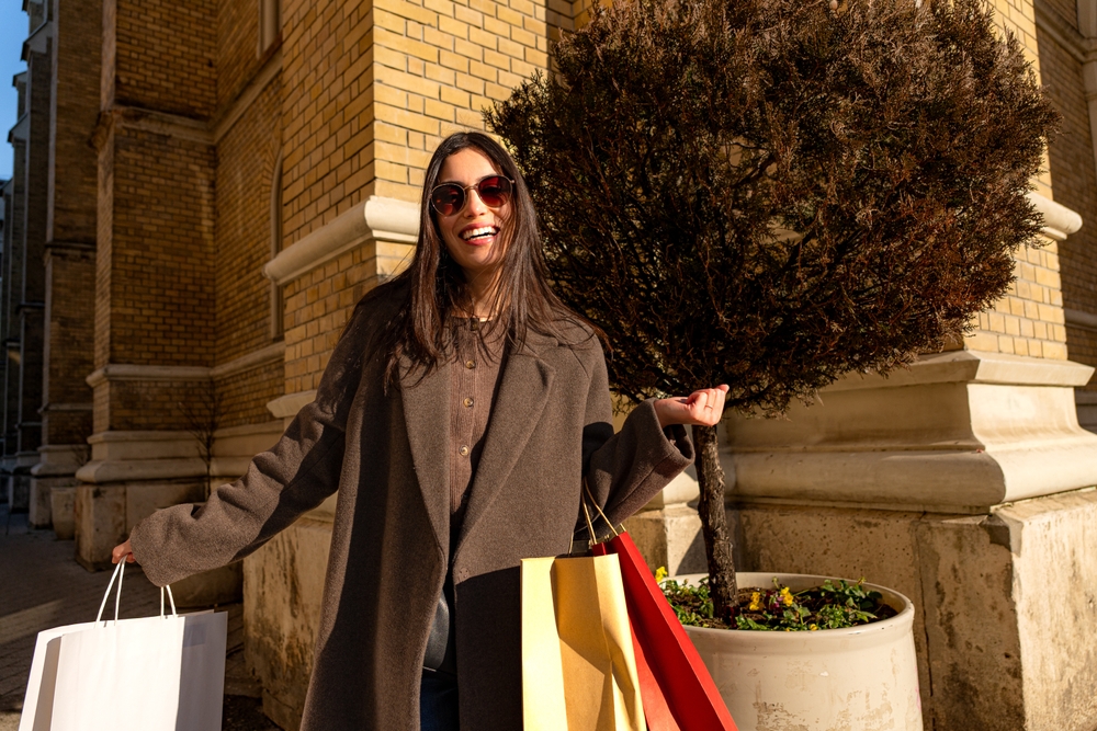 Жена, щастлива, че е напазарувала много подаръци. Снимка: Shutterstock