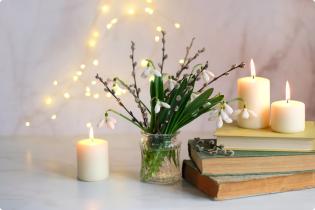 Кокичета, книга, запалени свещи. Снимка: Shutterstock
