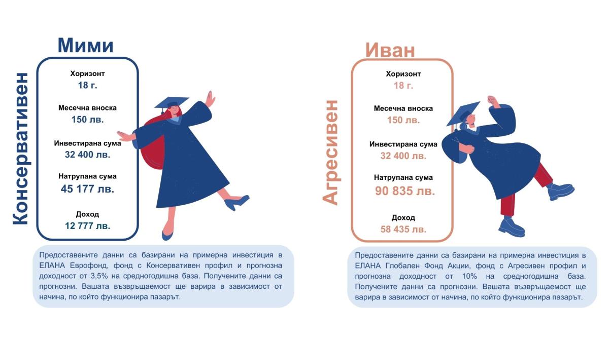 Семейството на 3-годишната Мими внася по 50 лв. месечно за 15 години, като избира фонд с по-нисък риск – например ЕЛАНА Еврофонд. Това носи умерена доходност и повече сигурност за инвестицията.