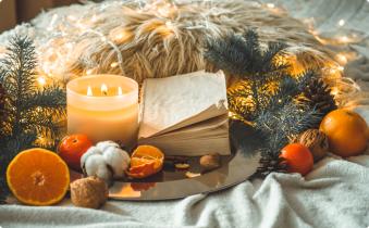 Книга, борови клонки, мандарини и свещ. Снимка: Shutterstock