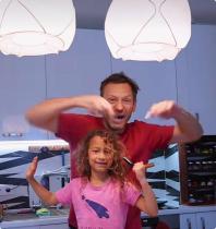 Сънен и по пижама, синът на Ивет Лалова и Симоне Колио отваря врата на спалнята, за да го посрещне изненада – букет от сребърни и златни балони, пълни с хелий, и подъръци под тях.