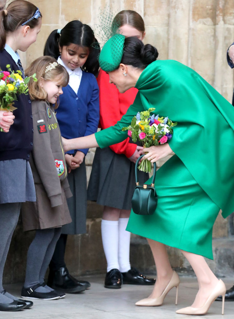 Херцогинята на Съсекс носеше зелена рокля на Emilia Wickstead с елегантна шапка фасинатор William Chambers.