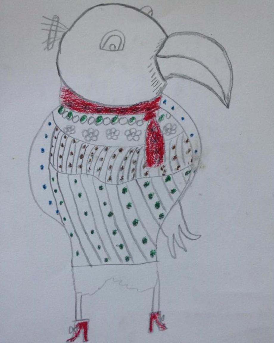 Цвети е развихрила въображението си на макс, като е нарисувала една наконтена гарга с гердан, шарена рокля и червени обувки на токчета. Бива си я!