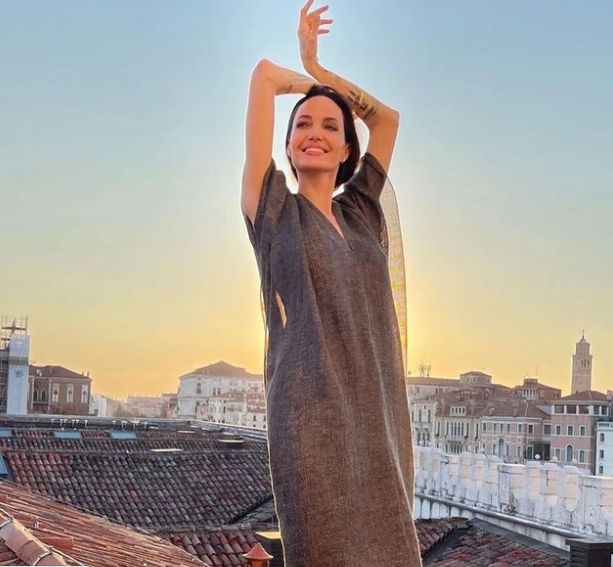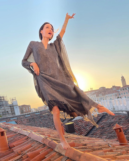 На кадрите се вижда как актрисата и многодетната майка позира спокойно в широка рокля и боса, стъпила стабилно на покрива.