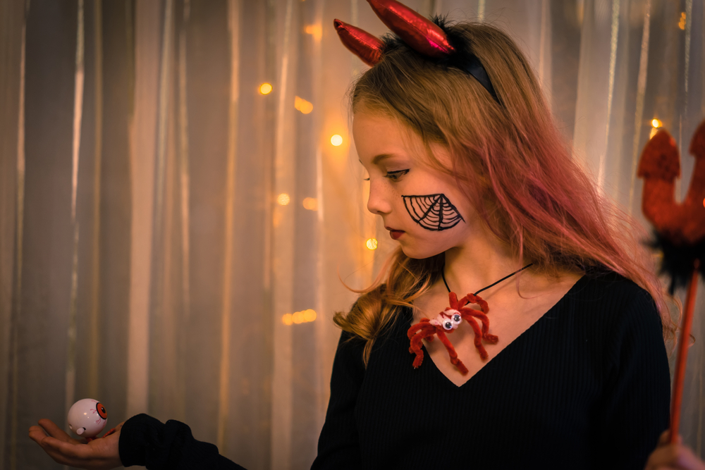 На малките госпожици със сигурност ще им допадне, а и този грим не е толкова страховит. Задължителен аксесоар са дяволските рогца. Очите се очертават с очна линия, само на горния клепач. Устните са кърваво червени. А на едната буза може да изрисувате с черен молив за очи фина паяжина.