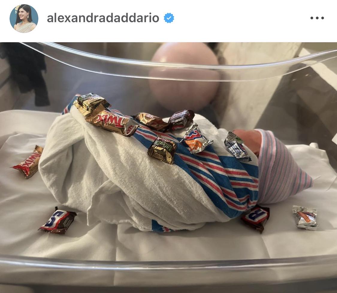 „Мисля, че това е странна купа с бонбони“, озаглави Дадарио публикацията си, шегувайки се със снимката, на която бебето е повито в одеяло, покрито с мини бонбони - намигване към Хелоуин, когато се предполага, че се е родило. Актрисата все още не е споделила нито името, нито пола на бебето.